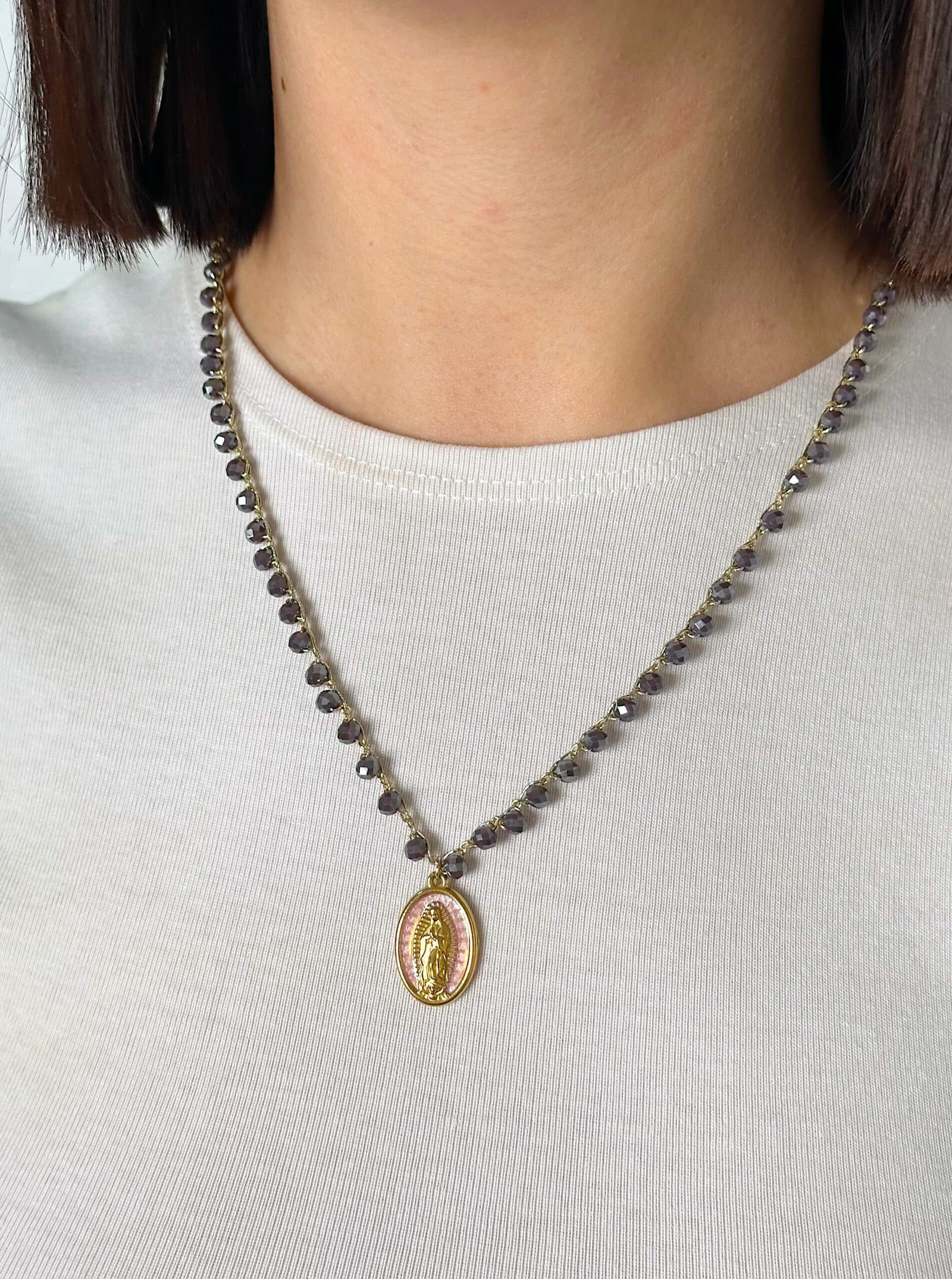 Collar tejido a mano con hilo metalizado dorado y piedras de cristal, cierre ajustable de acero inoxidable y medalla nacarada de acero inoxidable.